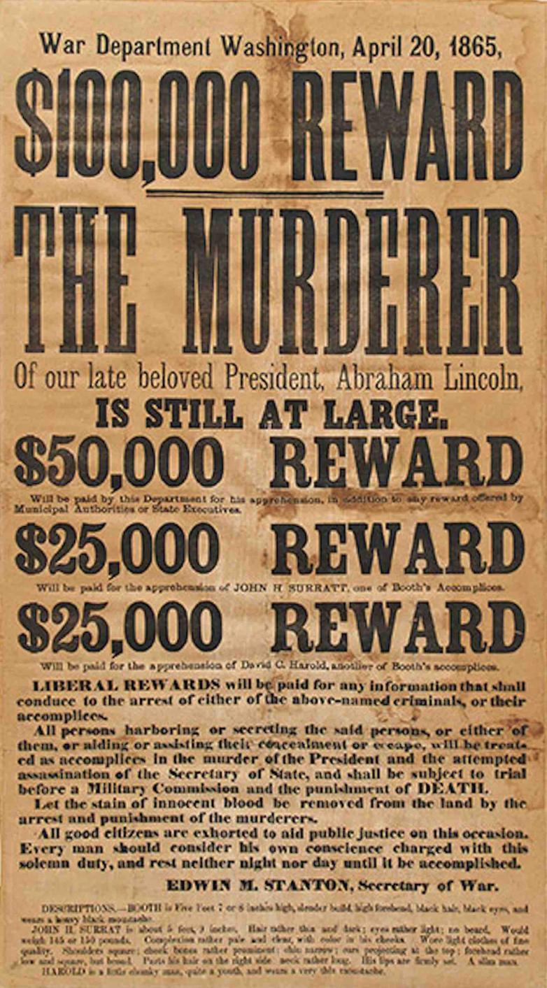 In large, bold type, poster reads ''$100,000 REWARD / THE MURDERER / Of our late beloved President Abraham Lincoln, / IS STILL AT LARGE''. Reward money for each man is listed, and at the bottom, their descriptions: Booth is ''Five Feet 7 or 8 inches high...black hair, black eyes, and wears a heavy black moustache.''; in later printings, the public is warned that Booth has likely shaved off his moustache. John H. Surratt is described at length, and then David E. Herold (here misspelled as ''David C. Harold'') is described as ''a little, chunky man, quite a youth, and wears a very thin moustache.''