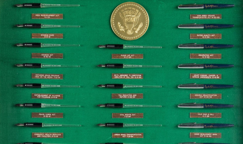 The John F. Kennedy and Lyndon B. Johnson: Collection of Presidential Bill Signing Pens features 50 fountain pens used by the country’s 35th and 36th presidents. Among the bills signed into law with pens from this collection are the Civil Rights Act, which Johnson signed July 2, 1964, the Minimum Wage Act (May 1961), the Peace Corps Act (September 1961), the Clean Air Act (December 1963), the Food Stamp Act, the Voting Rights Act (August 1965), Immigration Act (October 1965) and the 25th Amendment (Presidential Continuity) to the Constitution (February 1967).