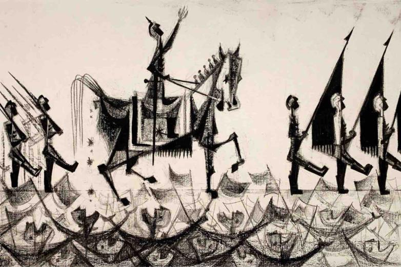 Without a single written word, The Parade tells the story of events that the artist experienced first hand: armistice parades after World War I, the rise of Nazism, World War II, the Holocaust, and finally, post war celebrations. More broadly, the drawings speak to the cycle of war, the seductive glory and pomp, followed by soldier enlistment, community deprivation, devastating destruction, death, and heartbreak. When the war ends, the cycle repeats.