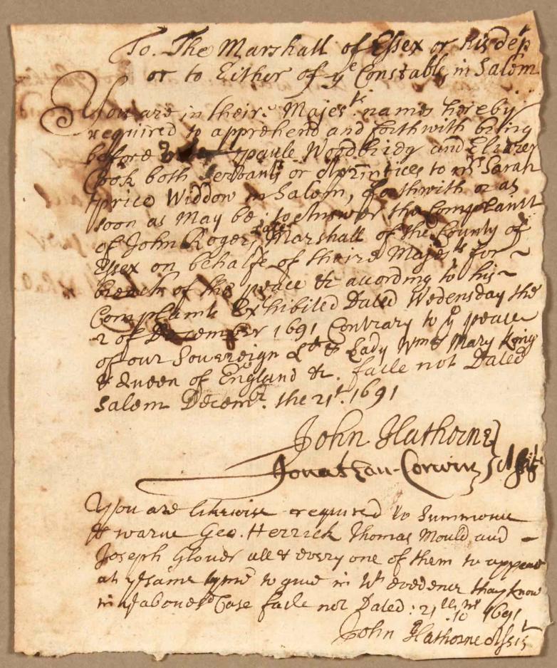 * An original arrest warrant, December 1691, signed by three leading figures from the Salem witch trials: John Hathorne, Jonathan Corwin, and George Herrick. Penned just weeks before the initial interrogations of the “witches.”